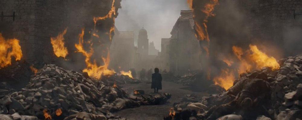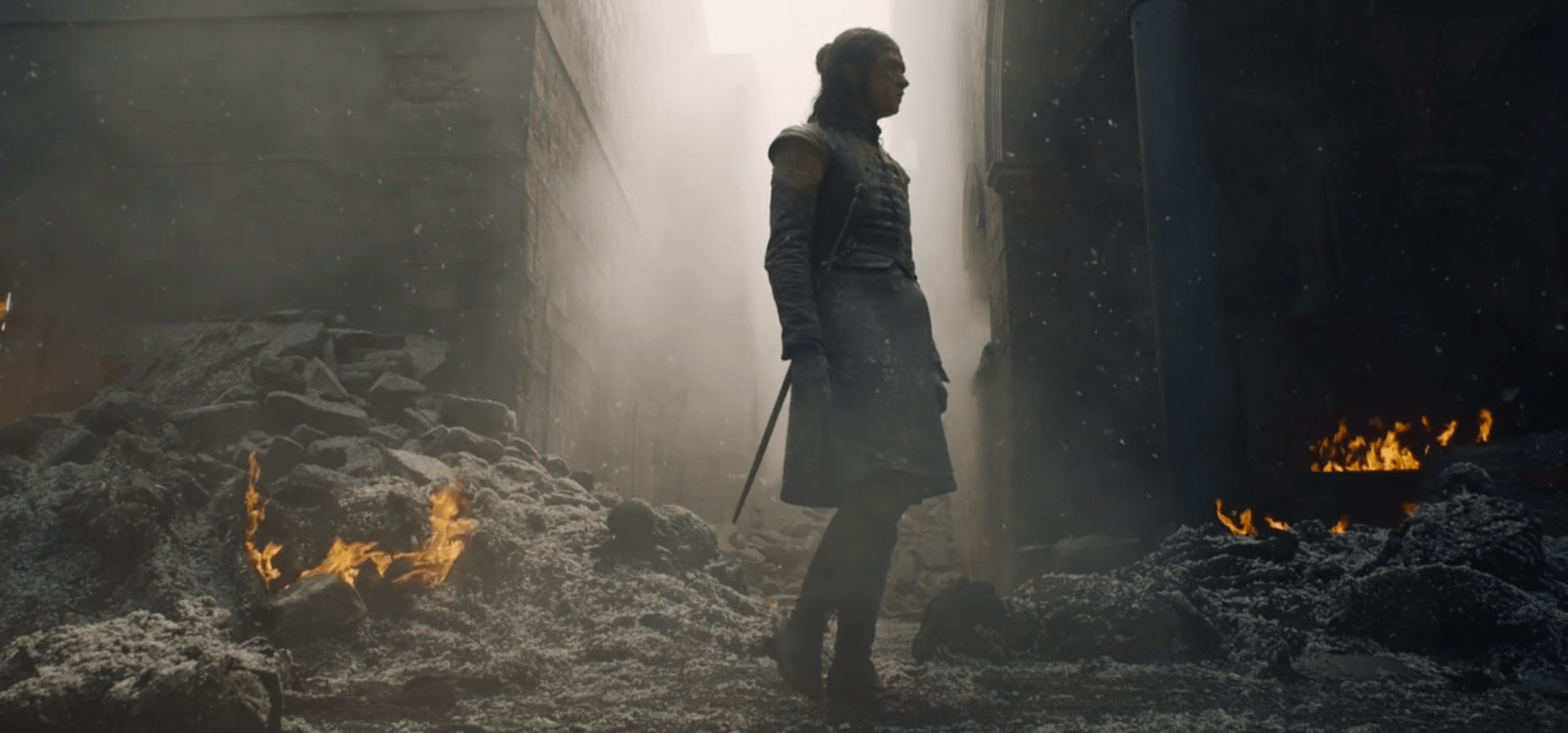Die Folge schließt ab indem wir Arya bei ihrer Flucht begleiten. Sie hat es nicht geschafft jemanden zu retten, sie steht nur machtlos zwischen den Trümmern der Stadt während Asche auf sie regnet. Wieder bleiben wir symbolisch. Die Asche erinnert an kalten Schnee – der Winter ist in Königsmund angekommen und die Drachenkönigin bringt ebenso den Tod mit sich wie der Nachtkönig.