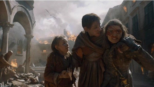 Die Ereignisse gehen Schlag auf Schlag und jetzt erreichen Sandor und Arya die Festung. Er redet ihr ins Gewissen und möchte sie dazu bewegen, den Rückzug anzutreten statt in ihr Verderben zu rennen, um Cersei zu töten. Er rät ihr nicht so zu werden wie er, worauf sie ihm dankt und umkehrt. Sie versucht nun den Unschuldigen zu helfen der Flammenhölle zu entkommen, statt an dem Blutvergießen teilzuhaben.