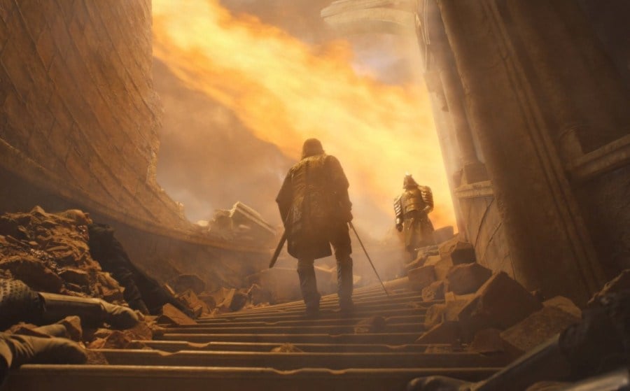 Die Inszenierung ist imposant, die teils zerstörte Treppe führt ins nichts und es ist jetzt schon deutlich, dass keiner der Brüder die Festung lebend verlassen wird. Während Cersei flieht, kommt es zu einem Showdown der Brüder. Tatsächlich ist Gregor bereits eher tot als lebendig und steckt jegliche Angriffe Sandors problemlos weg. Sogar als Sandor im einen Dolch durch den Kopf rammt, scheint es ihn kaum zu stören. Aus Verzweiflung stürzt Sandor seinen Bruder mit sich in das Flammenmeer unter ihnen. Ein sehr poetisches Ende für die beiden.