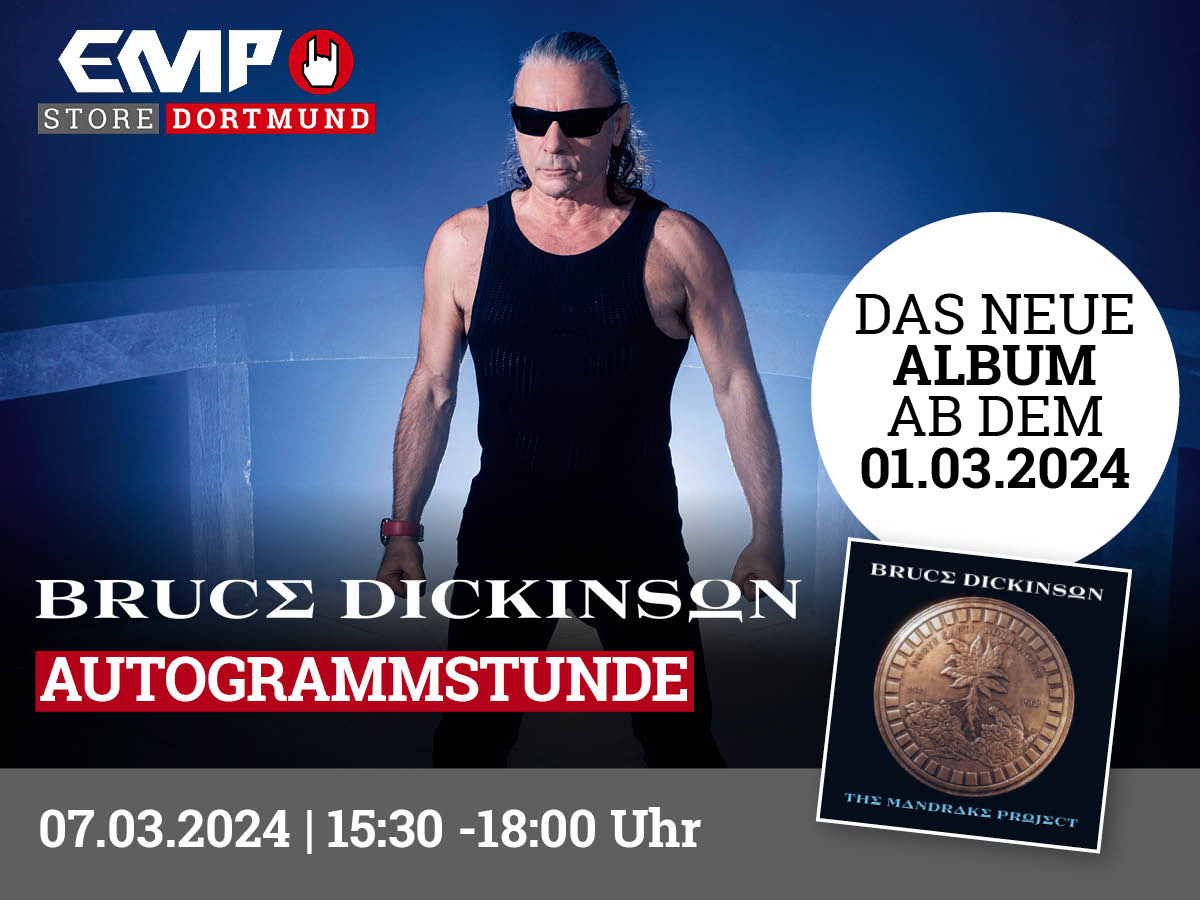 Dortmund/Deutschland. Das Warten hat bald ein Ende: Seit Bruce Dickinson sein siebtes Soloalbum “The Mandrake Project" (VÖ: 1. März) mit dazugehöriger Tour noch in diesem Jahr angekündigt hat, saugen Fans ungeduldig jede News zum Thema auf, während sie die ersten beiden Singles “Afterglow Of Ragnarok” und “Rain On The Graves” feiern. Und dank EMP können sie sich nun auf ein weiteres Highlight freuen, denn: Zur Feier des Album-Releases wird Bruce Dickinson höchstpersönlich zur Autogrammstunde im EMP Store Dortmund vorbeischauen.